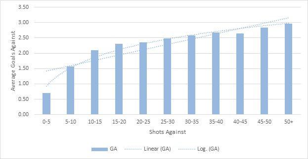 The chart below shows the average goals allowed plotted against the number of shots against for all games since 2007. What we see intuitively makes sense: as the number of shots faced increases so does the number of goals, but the trend is more logarithmic than linear. If save percentage increases with shots against, we wouldn’t expect goals allowed to double just because shots against doubled.